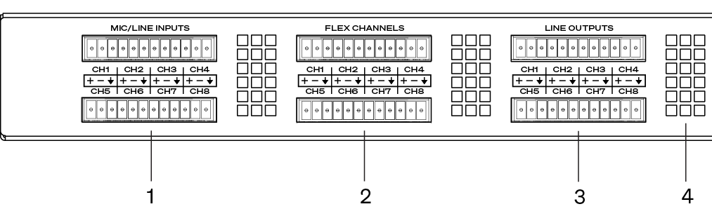 Flex Channels (8 channels - blue) - Configurable as Mic/Line Input or Line Output per channel