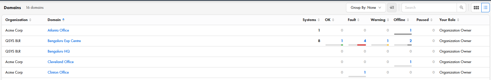 In the Q-SYS Reflect hierarchy, a Domain typically represents a physical location within an Organization. For example, hotel chains and restaurant chains have multiple locations, and each one of these could be a Domain within Q-SYS Reflect. Domains contain one or more Systems.