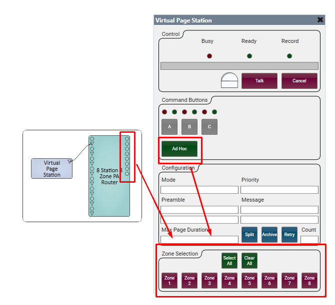 The Virtual Page Station is designed to be used on a touchscreen, and provides individual Zone selections and Group Zone selections. The Virtual Page Station can be automated by a script, or External Control. The Virtual Page Station component does not have an audio output pin, and does not have any parameters that relate to hardware. The Virtual Page Station's audio comes from an audio source connected directly to the PA Router.